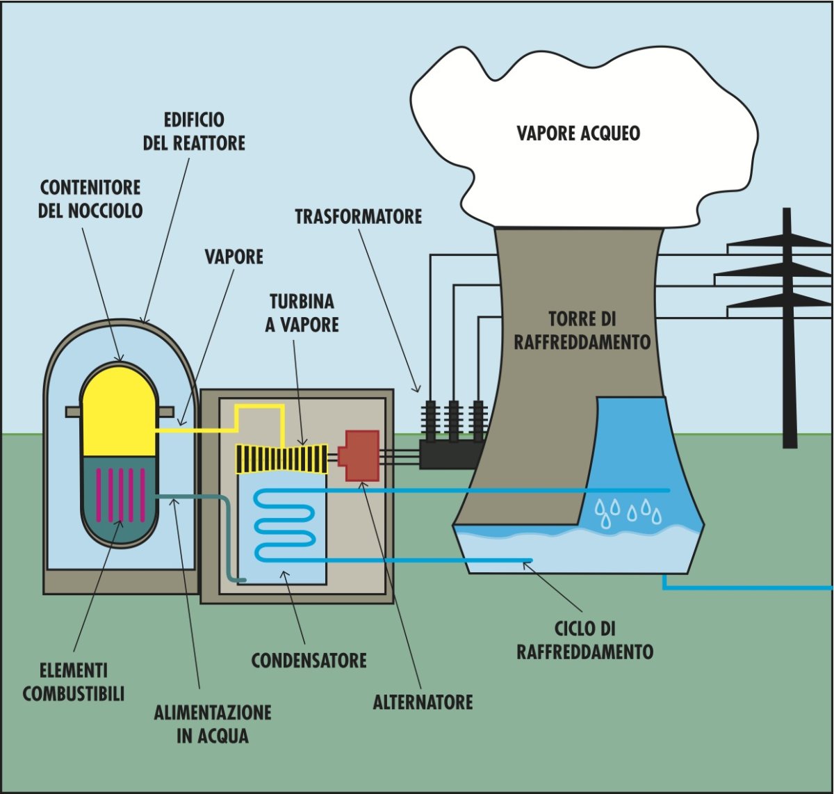 Una centrale nucleare funziona allo stesso modo solo che anziché bruciare gas, si sfrutta una proprietà chimica dell’uranio. Infatti il nucleo dell’uranio colpito da un neutrone si divide in due nuclei più leggeri liberando altri neutroni (per questo si chiama “nucleare”). Questi neutroni colpiranno altri nuclei che a sua volta libereranno altri neutroni, innescando una reazione a catena che produce energia e che non avrebbe fine se non venisse controllata. Per controllarla ci sono delle barre cosiddette “di controllo” e dell’acqua refrigerante intorno. Se le barre di controllo vengono inserite tra le barre di uranio, la reazione a catena si spegne e cosi’ anche la produzione di energia. Quindi non c’è nulla di spaventoso nella parola “nucleare”.
